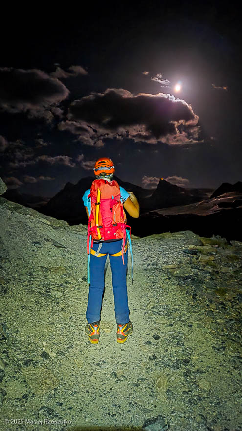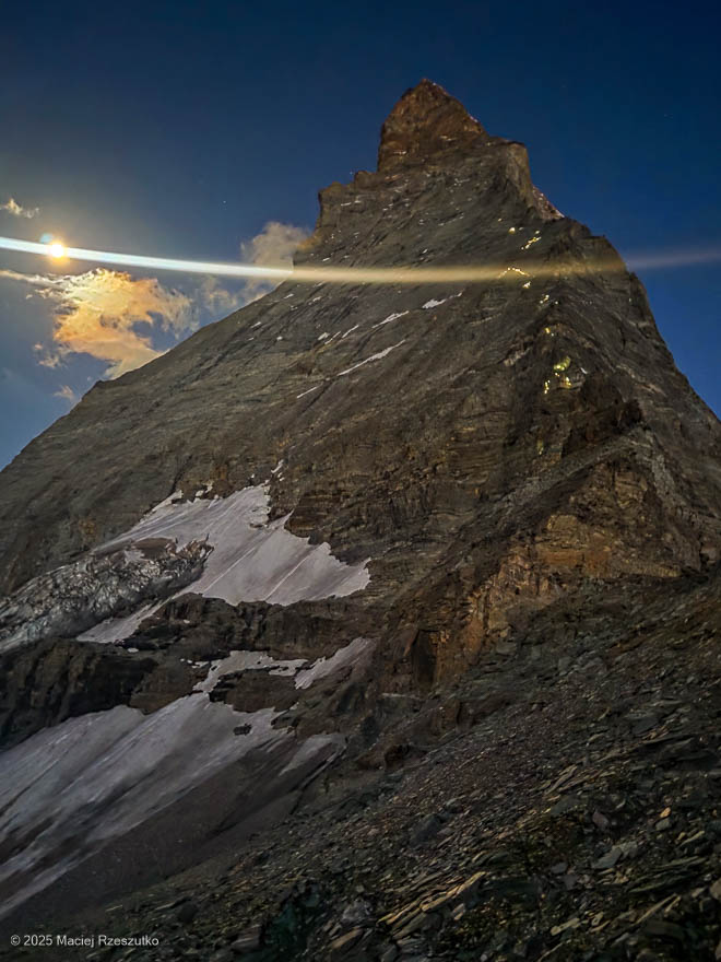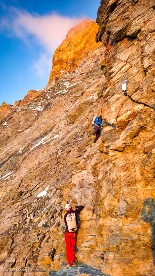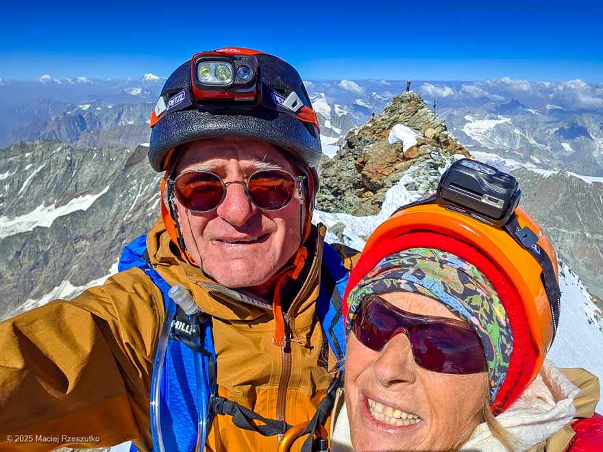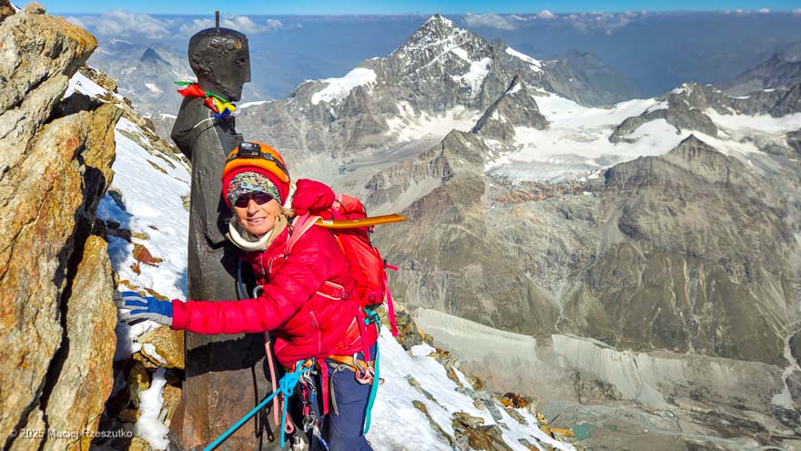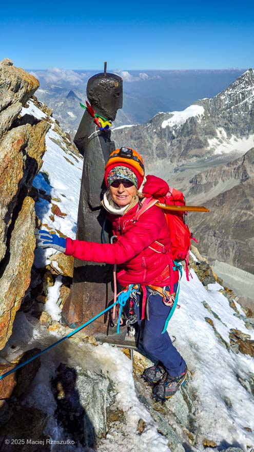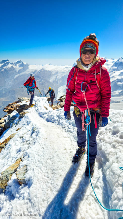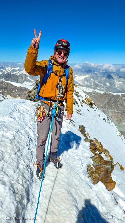 Maria vient de réaliser son rêve 🥳 ! Après un but à 150 mètres du sommet du Cervin en 2023, cette fois-ci ça passe nickel. Plus de places dispos à Hörnlihütte, nous sommes partis de l’hôtel Schwartzsee à 2600m d’altitude. Du coup 1900mD+ au lieu de 1200. C’était un peu long, mais finalement pas tant que ça pour une cordée d’amateurs sexagénaires. J’ai trouvé assez pénibles les dernières cordes fixes. Puis 40 mètres de glace au début du « toit ». Malgré la relative facilité des passages d’escalade, il ne faut surtout pas sous-estimer cette longue course !