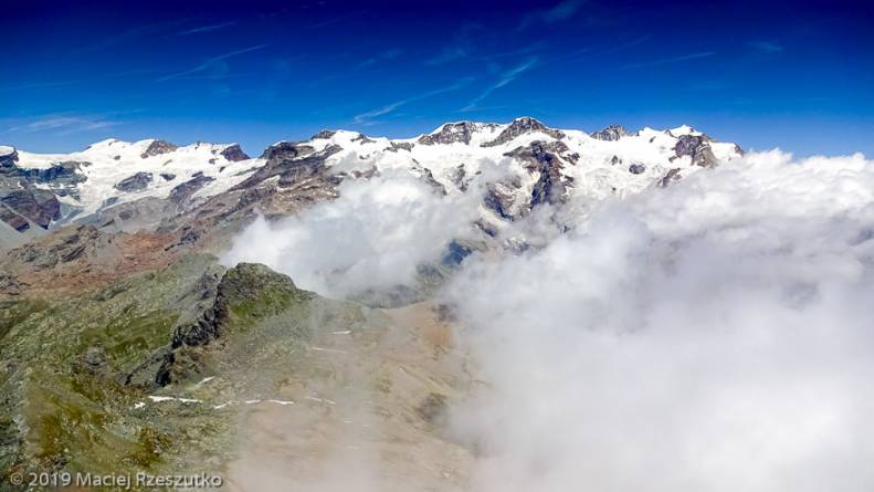 Une montagne austère qui semble inaccessible, défendue par des contreforts schisteux inabordables. Son prolongement direct vers le Mont Rose la dote d’un atout supplémentaire : le Breithorn 4165m, le Lyskamm 4527m, le Cervin 4478m et les cimes multiples du massif déploient sans retenue l’immensité éclatante de leurs glaciers.