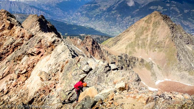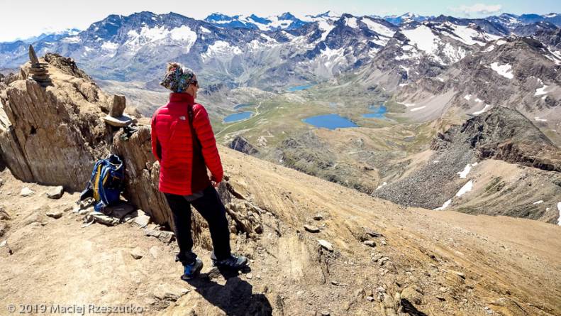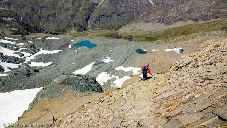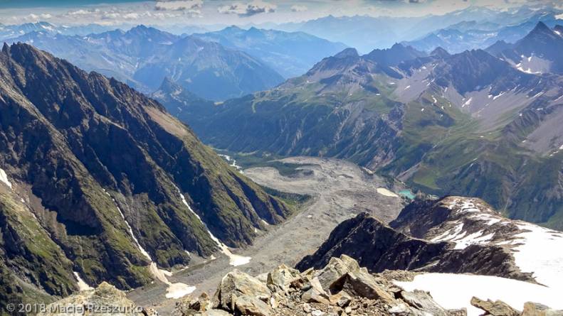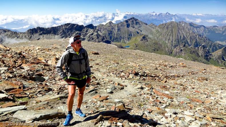 Il est rare que le traileur puisse monter à une telle altitude ! La Pointe Rousse est associée à la cime prestigieuse de la Grivola 3968m, qui occulte l’horizon par son imposante présence, sans dissimuler toutefois le Mont-Blanc et l’ensemble Grandes Jorasses – Mont Dolent. Dans l’autre direction, l’enfilade des cimes du Massif du Grand Paradis semble plus complexe.